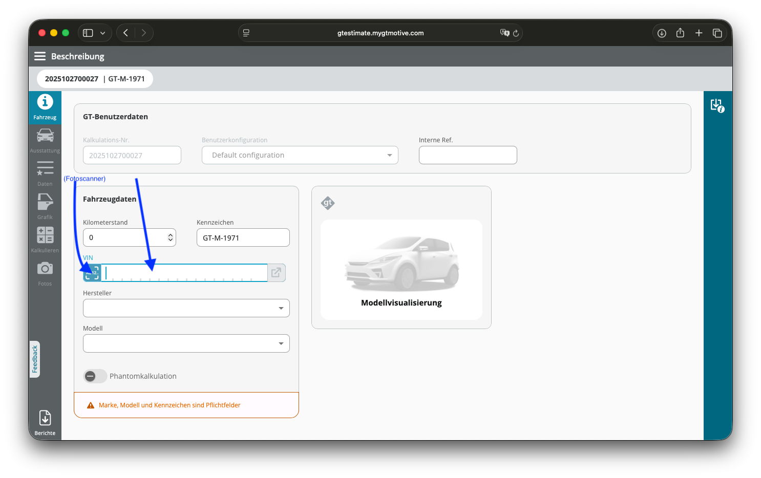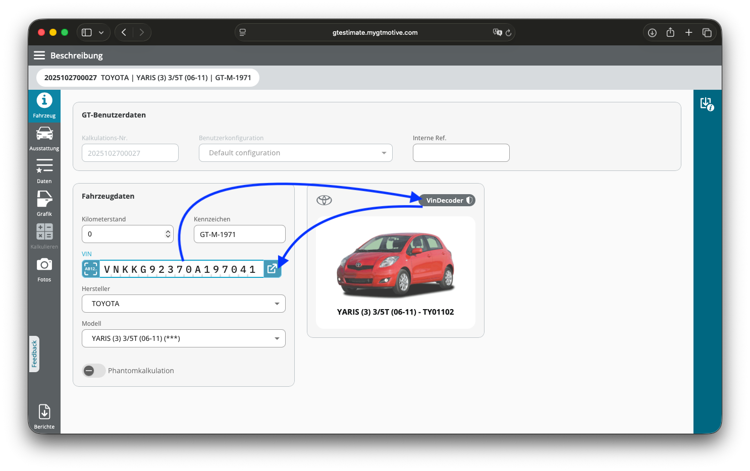 Zur präzisen Identifikation eines Fahrzeuges kannst Du über GT Estimate technische Herstellerdaten zur Fahrgestellnummer abfragen. Entweder direkt über dein DMS, oder wie hier im Weblogin über den Reiter „Fahrzeug“. Du gibst die Fahrgestellnummer im Feld VIN ein, oder lässt sie über den Fotoscanner einlesen. Anhand der Codierung werden Marke- und Basismodell ohne Ausstattungsoptionen bereits erkannt, als Datenquelle wird dir der VIN-Decoder als Hinweis angezeigt.