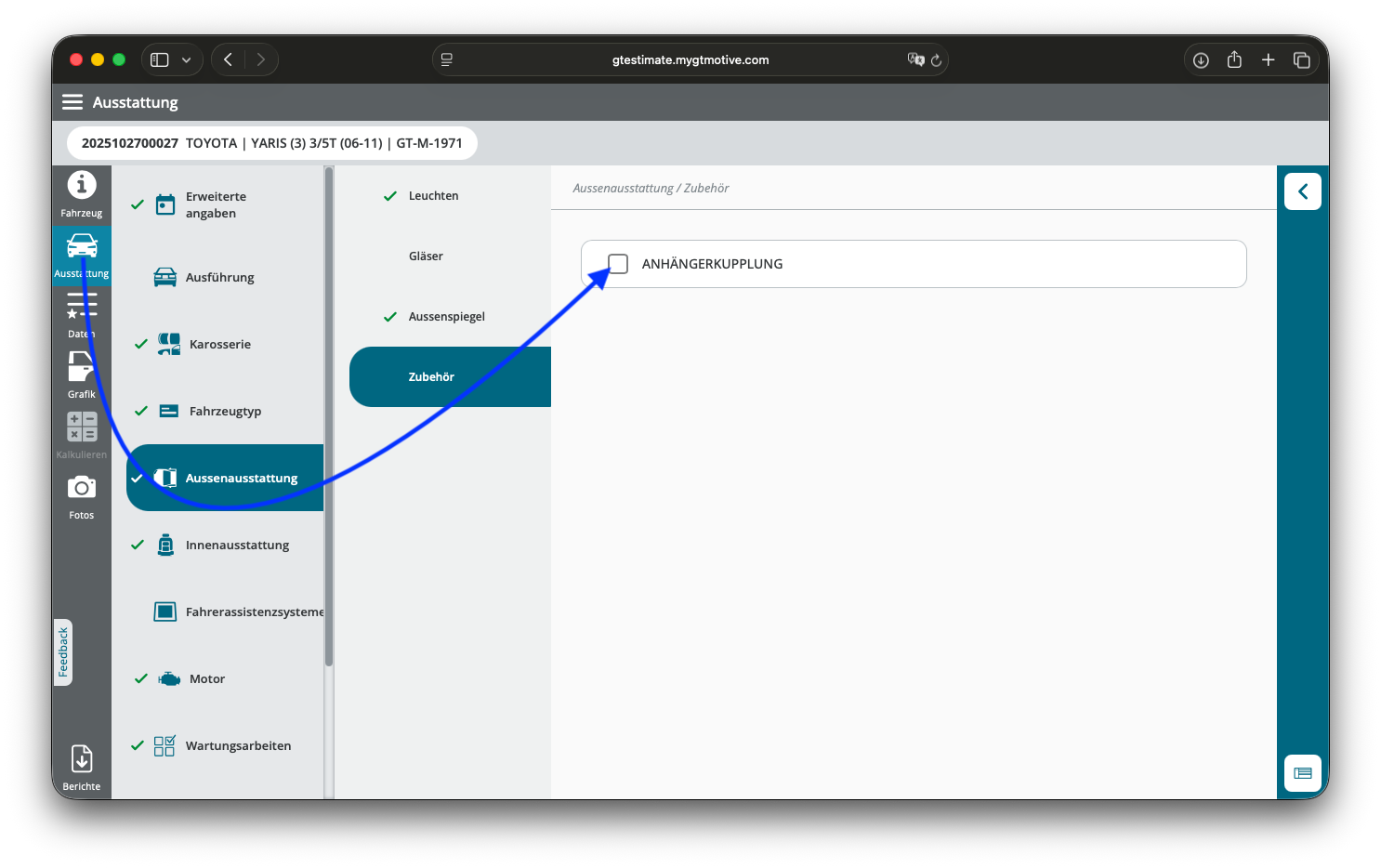 Über den Reiter „Ausstattung“ werden Dir Ausführung und Zusatzoptionen nochmal im Detail angezeigt. Wenn am Fahrzeug noch nachträglich Modifikationen vorgenommen wurden, kannst Du diese direkt hier in den entsprechenden untergeordneten Kategorien bei Bedarf anpassen.