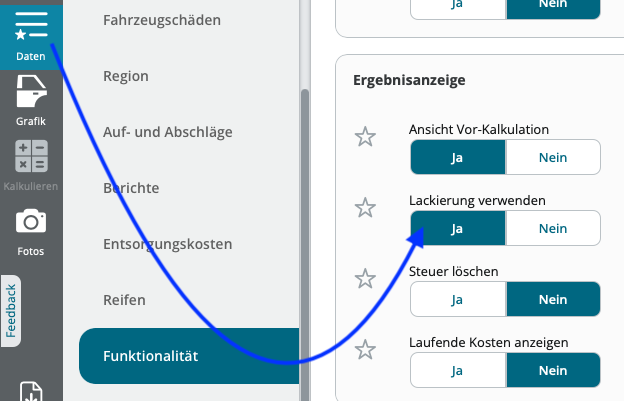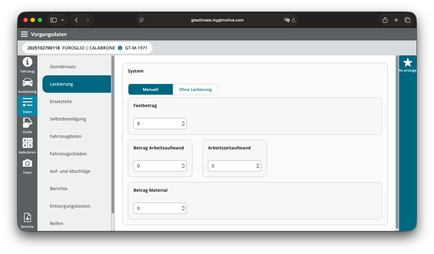 Du hast in GT Estimate für Deutschland, Österreich und Schweiz die Möglichkeit nach AZT, Hersteller, manuell oder ganz ohne Lackierung zu kalkulieren. Der Funktionsschalter „Lackierung verwenden“, der per Standard auf "ja" steht, stellt zunächst sicher, dass die Lackwerte im Ergebnis dargestellt werden.