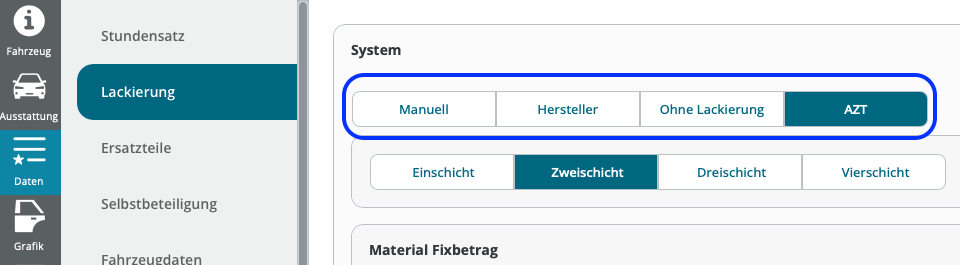 Für die Auswahl des gewünschten Lackiersystems klickst Du im Bereich Daten unter Lackierung auf das entsprechende Feld aus, und je nach Auswahl des Lackiersystems ändern sich nun die angezeigten Optionsfelder.