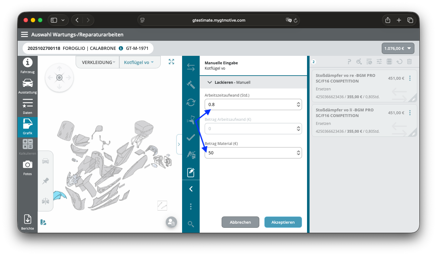 Im manuellen Modus wirst Du bei jeder Operation „Ersetzen“ oder „Lackierung“ nach den pauschalen Materialkosten und dem Arbeitsaufwand, wahlweise pauschal oder nach Zeit, gefragt.