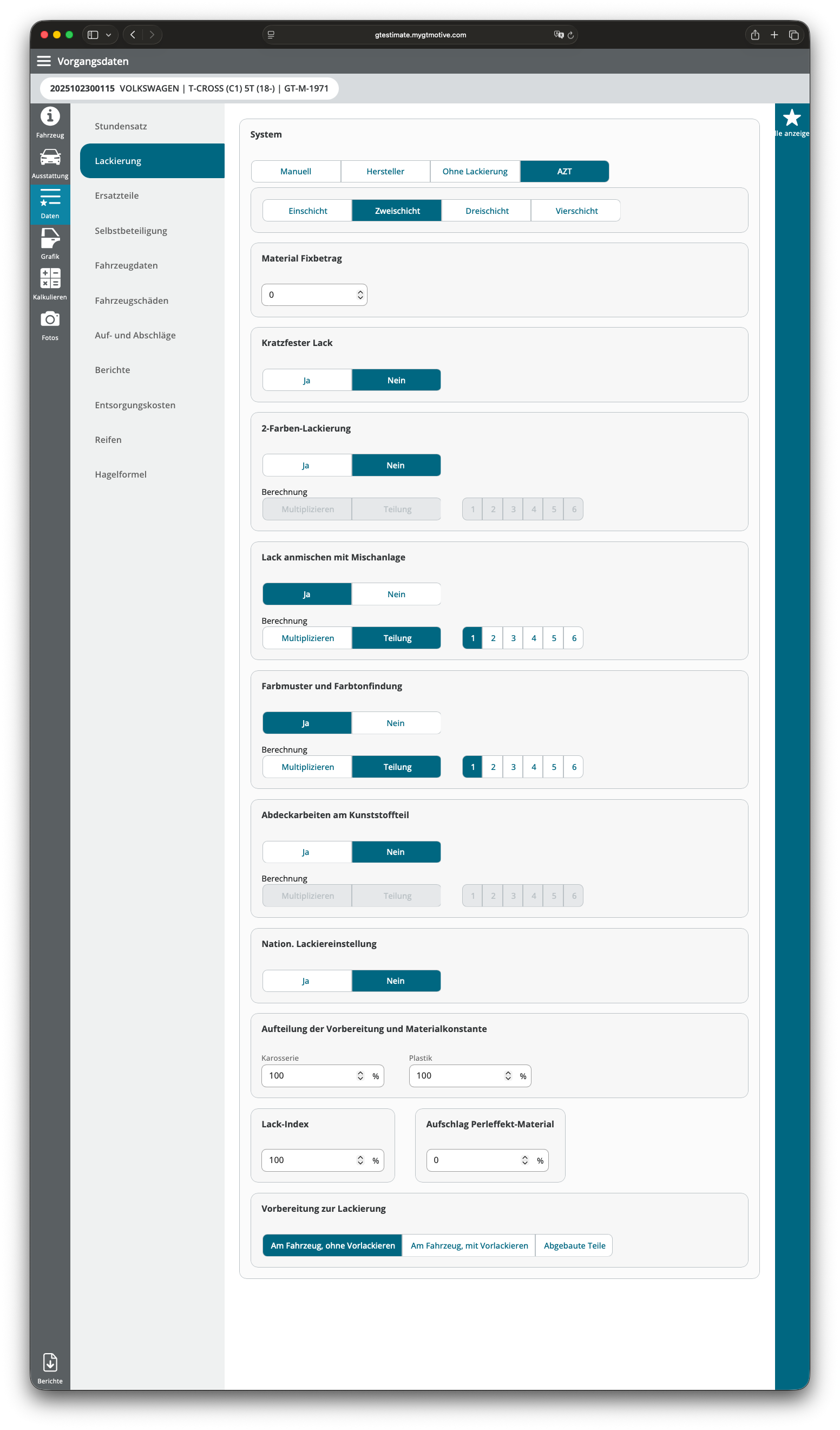 Für die Lackkalkulation nach AZT kannst Du in GT Estimate vorab eine Vielzahl an Parametern festlegen. Dazu wählst Du im Bereich Daten als Lackiersystem "AZT" aus. Wieviele Lackschichten je Fahrzeugmodell anfallen, wird durch die VIN-Abfrage bereits vorbelegt, was sich aber nachträglich anpassen lässt.