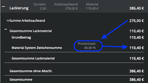 Materialbetrag des Lohns kalkuliert das Lackmaterial prozentual vom Lackierlohn entsprechend der Eingabe anstelle der OE Berechnungsmethode.