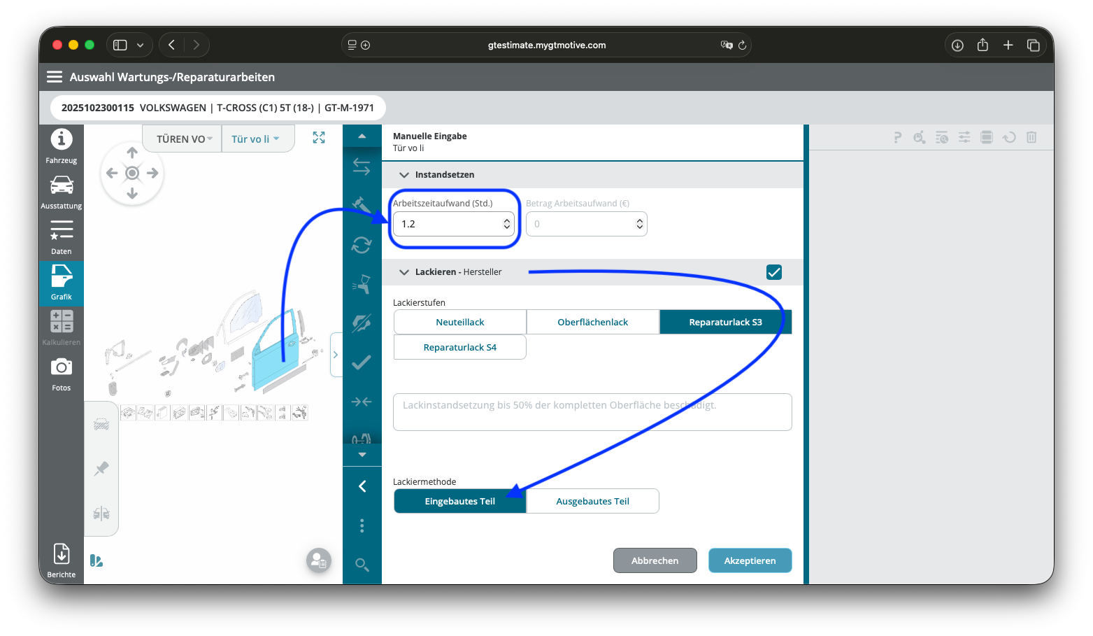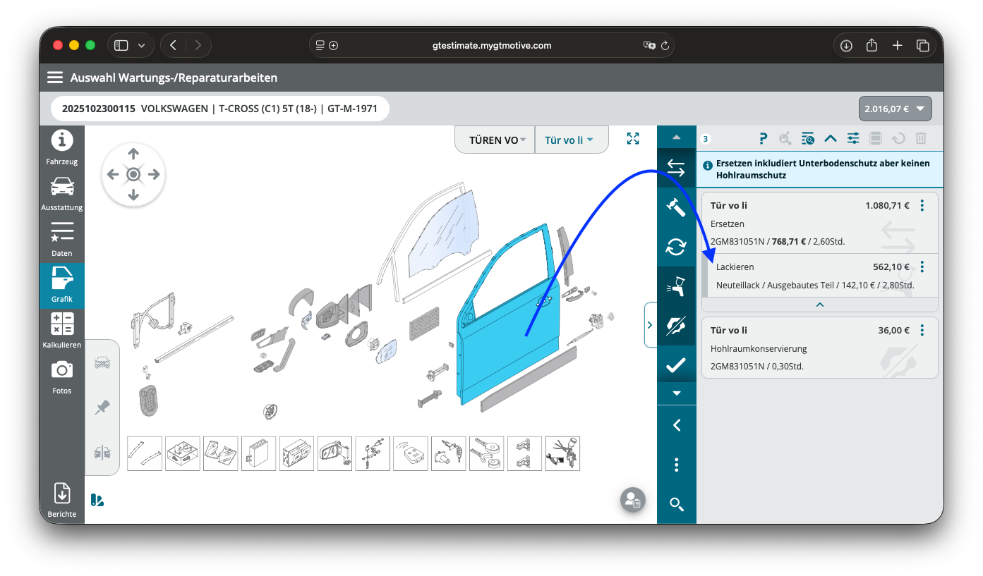 Danach solltest Du noch entsprechende Lackierteile aus- und einbauen - viele Hersteller bieten dafür eigene Arbeitspositionen an, wie hier zu sehen.