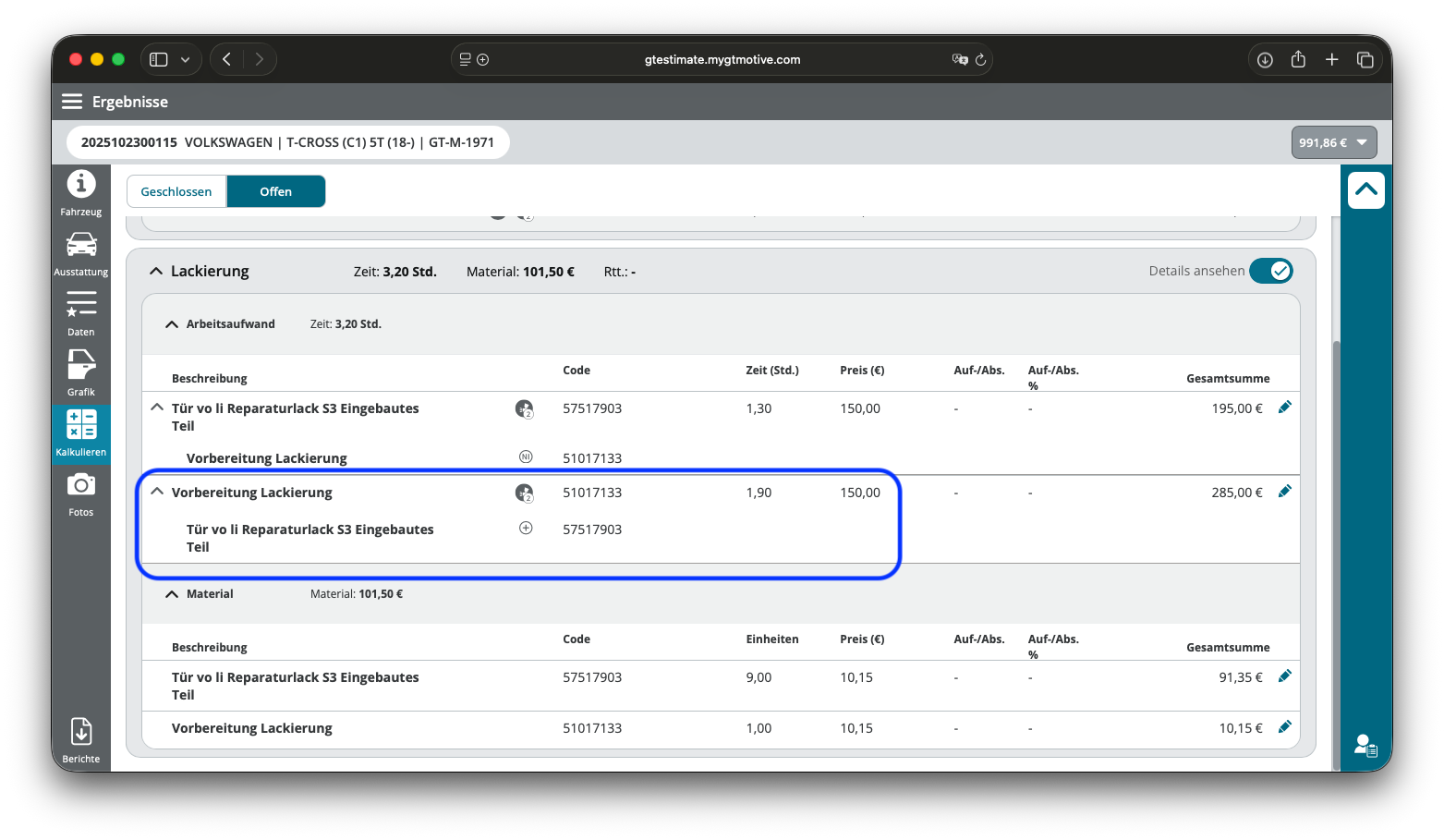 4. Im Kalkulationsergebnis werden Dir alle gewählten Lackierpositionen angezeigt. Das System rechnet immer mit der größtmöglichen Vorbereitungszeit, wenn verschiedene Vorbereitungszeiten je nach Bauteil ausgewählt sind. Hier wird der Kotflügel am Fahrzeug, die Tür jedoch abgebaut lackiert.