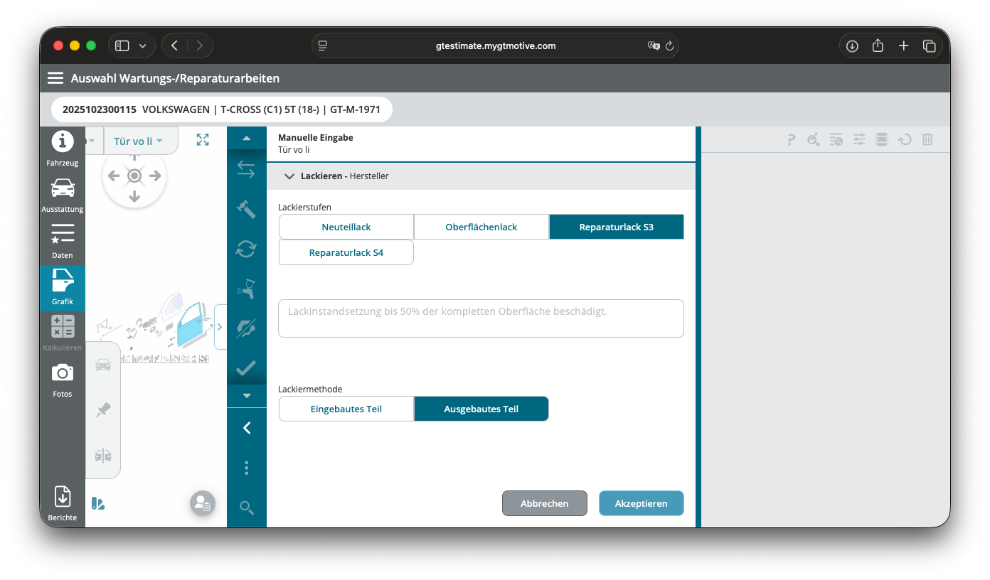 In GT Estimate werden kannst du an verschiedenen Stellen Lackierpositionen mit unterschiedlichen Lackstufen auslösen, darunter Neuteillack, Oberflächenlack und Reparaturlack. In diesem Artikel gehen wir die wichtigsten Möglichkeiten Schritt für Schritt durch.