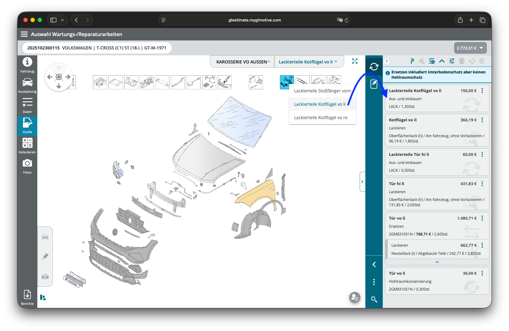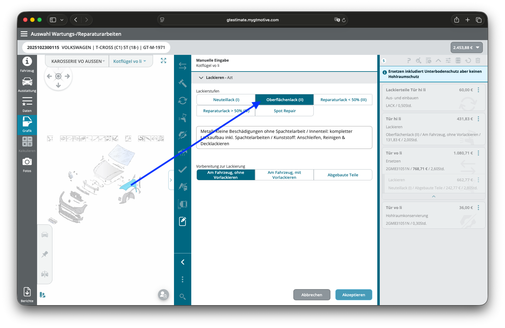 In GT Estimate kalkulierst Du diese Position mit einer einfachen Oberflächenlackierung der jeweilig angrenzenden Teile. Dazu wählst Du diese wie hier zu sehen aus, klickst auf "Lackieren" und wählst die Lackstufe 2 - gleich ob Du nach AZT oder Hersteller-Lackierung kalkulierst.