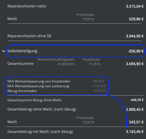 In der Schlusskalkulation fassen wir die Abwertungspositionen getrennt von der Selbstbeteiligung zusammen und weisen diese getrennt aus, sodass Du zwischen den netto Reparaturkosten ohne MwSt. und den Gesamtkosten nach Abzug unterscheiden kannst.
