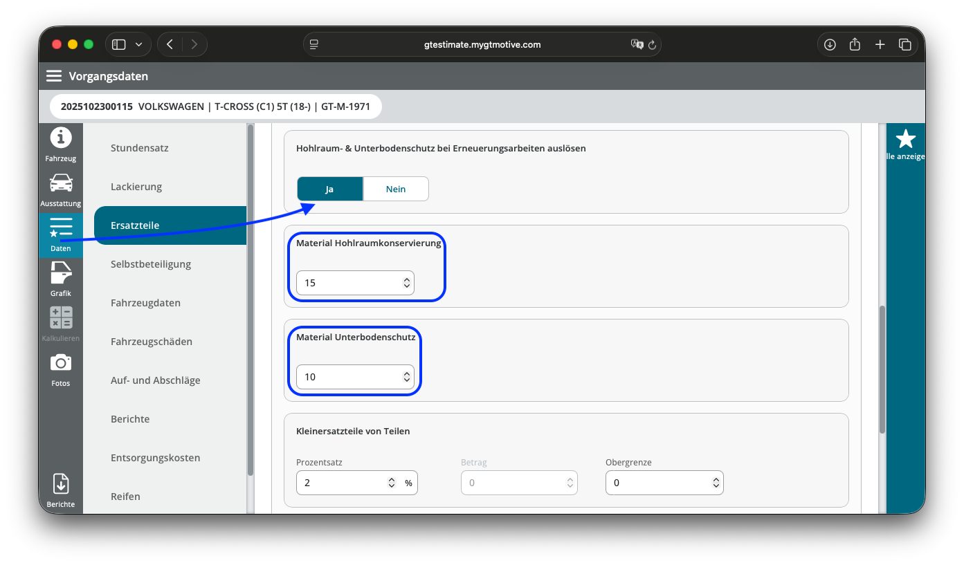 GT Estimate bietet Dir eine einfache Möglichkeit, Arbeiten für Hohlraumkonservierung und Unterbodenschutz zu kalkulieren. Dafür aktivierst Du zunächst im Arbeitsumfeld bzw. im Bereich Daten->Ersatzteile die Einstellung "Hohlraum- & Unterbodenschutz bei Erneuerungsarbeiten auslösen". Hier kannst Du gleich noch pauschale Materialkosten für diese Arbeiten festlegen, hier 15€ für die Hohlraumkonservierung und 10€ für den Unterbodenschutz.