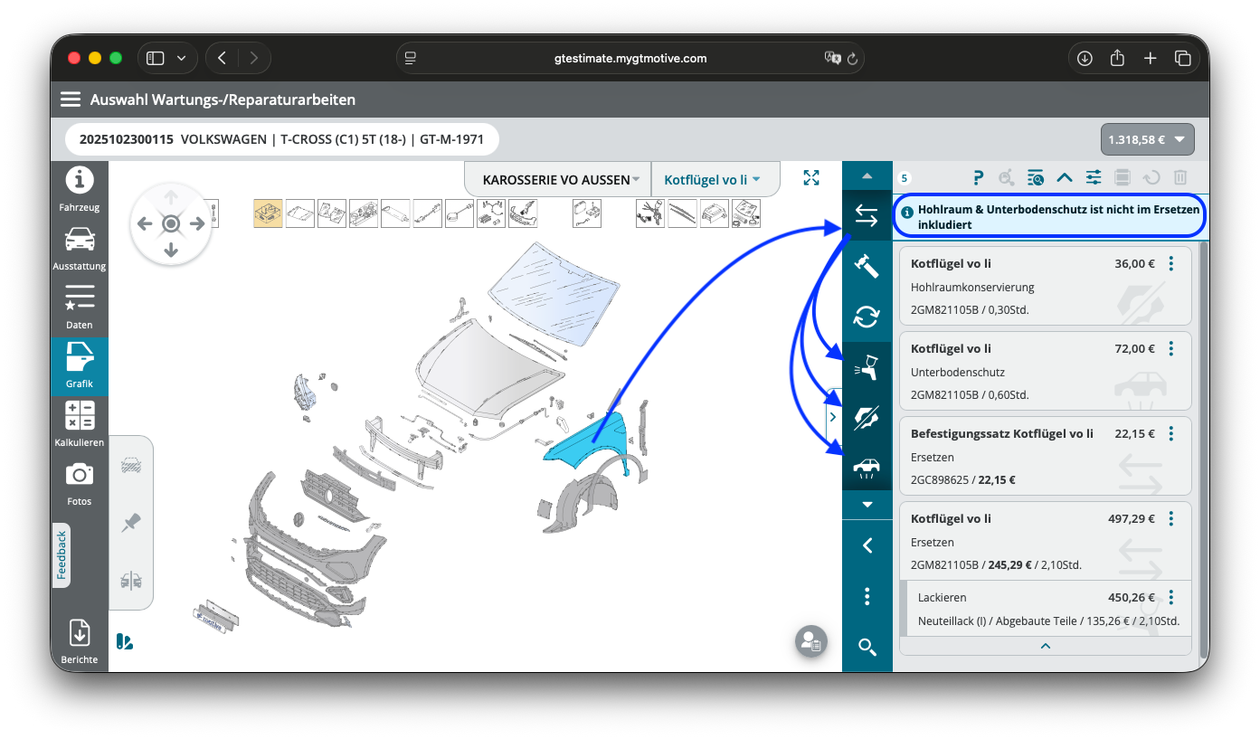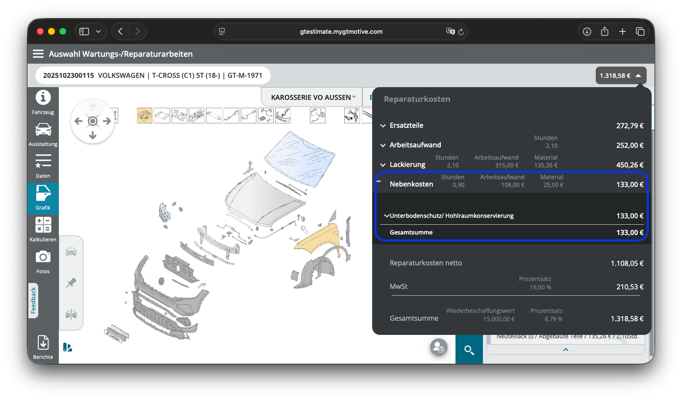 Nun werden bei Erneuerungsarbeiten die Positionen Hohlraum- & Unterbodenschutz genau wie die Neuteillackierung automatisch hinzugezogen, insofern es laut Herstellervorgabe nicht schon in der Arbeitsposition "Erneuern" enthalten ist.