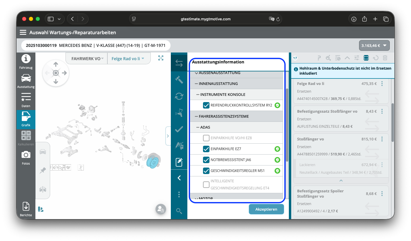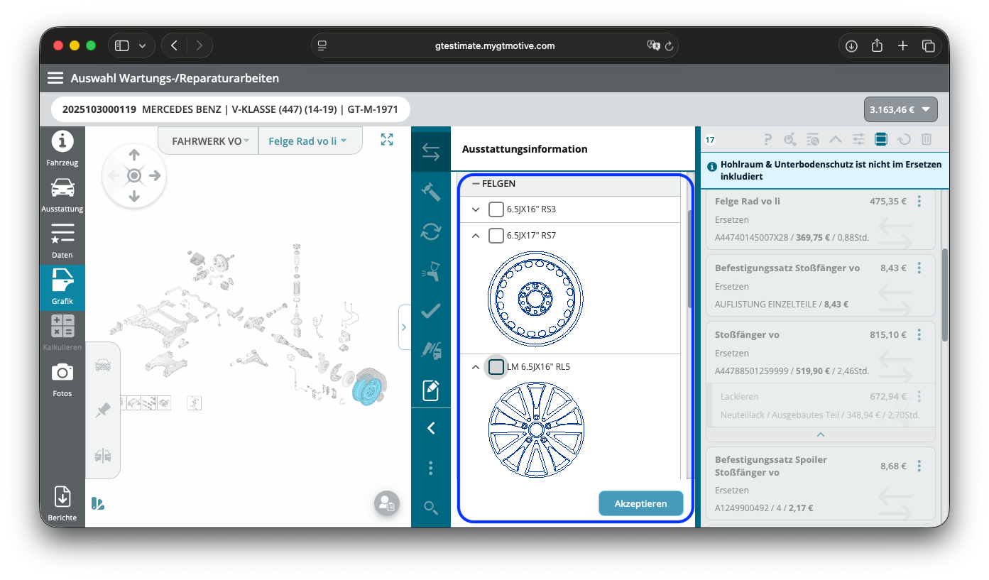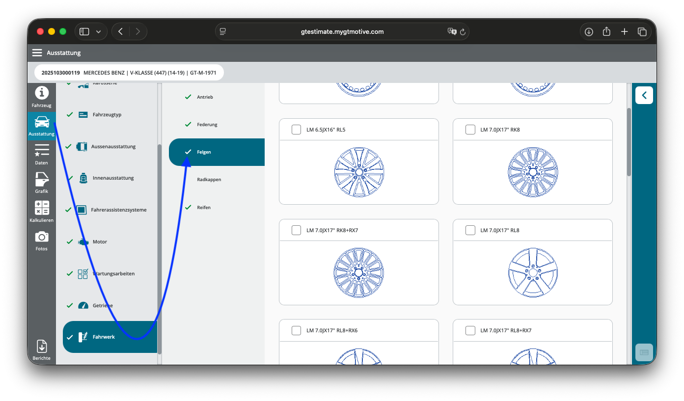 Du kannst auch nach der Fahrgestellnummerabfrage die Ausstattung manuell anpassen. Wenn beispielsweise auf dem Fahrzeug andere Orignal-Felgen seitens des Händlers nachträglich montiert wurden, kannst Du diese anhand der Grafiken im Unterpunkt Fahrwerk identifizieren und entsprechend ändern.