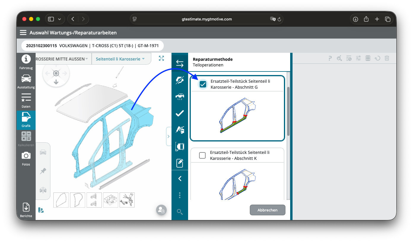 In GT Estimate bekommst Du die durch den Hersteller definierten Schnittzonen mit Klick auf das Bauteil automatisch angezeigt, wenn diese für das jeweilige Teil verfügbar sind. Hier wählen wir beispielsweise den Schweller zum Ersatz aus, um nicht die gesamte Seitenwand tauschen zu müssen: