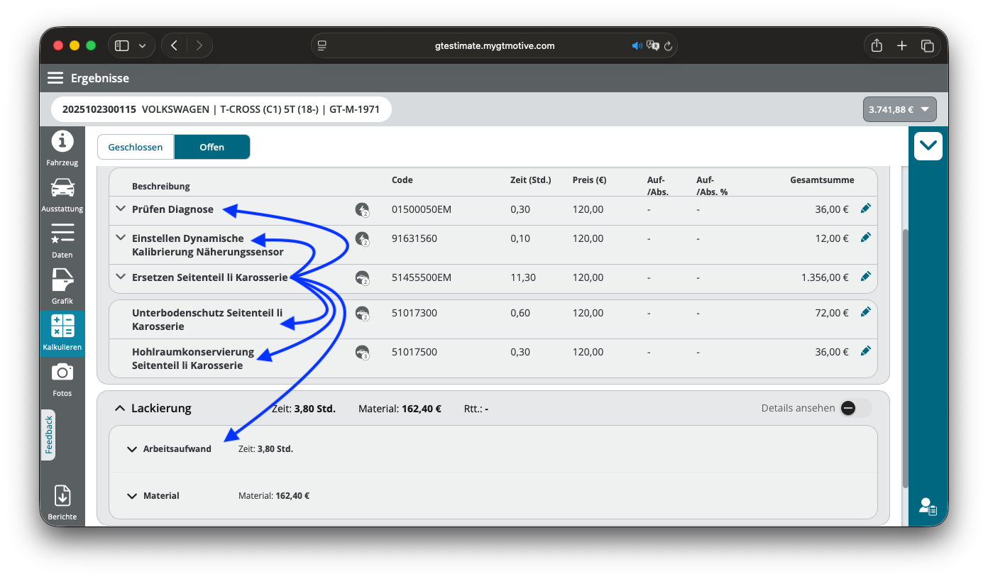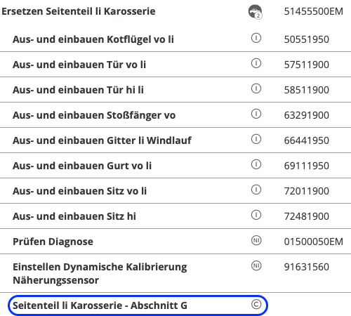 Das System berechnet die notwendigen Arbeiten inklusive Lackierung und fügt diese der Kalkulation zu. Achte im Herstellerlack dabei darauf, ob Du ggf. die Lackierwerte der Teilstücke anpassen musst, da nicht alle OEs die Lackdaten zum Teilersatz liefern, sondern nur für das Komplettteil.