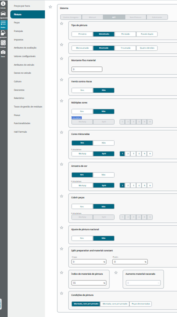 - Preparação para pintura define o valor padrão para peças montadas que serão pintadas durante reparações. Este valor pode ser alterado na captura gráfica do dano por peça; aqui apenas se define o valor padrão do campo de seleção.